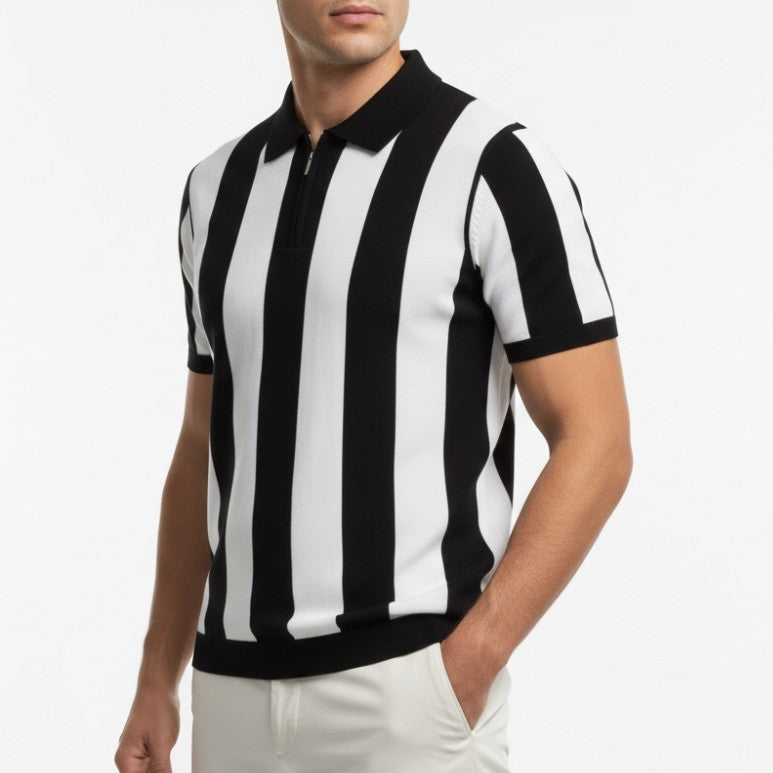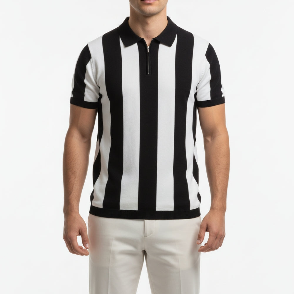 Soft knit fabric with contrast panel stripes gives this polo a sharp look with trousers or casual shorts. A metal zipper and ribbed collar keep it easy and comfortable.